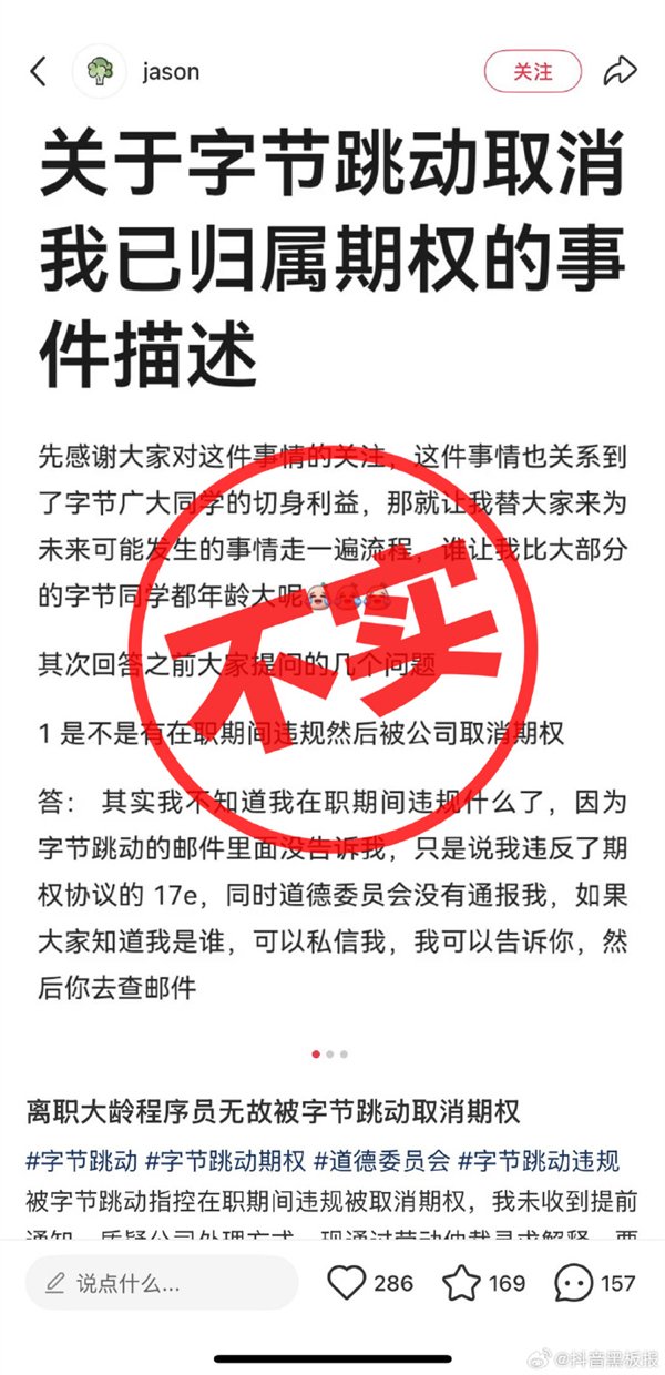 “请大家注意甄别信息,还会采取同步行业联盟、根据双方签署的期权授予协议扣除全部期权等措施。除依法追究行为人的法律责任外,有字节前员工在发贴称“离职大龄程序员无故被取消期权”,